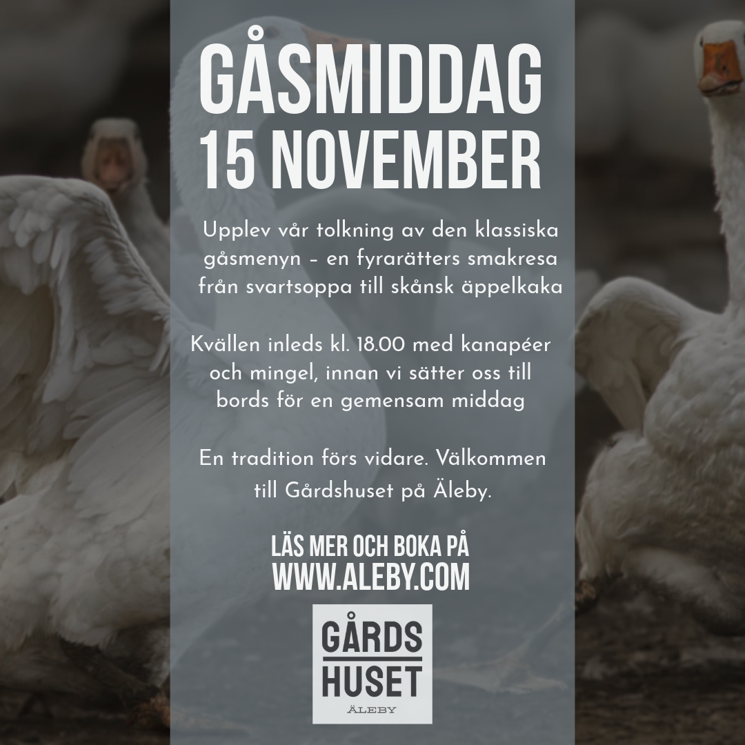 - För tredje året i rad bjuder vi in till vår traditionella gåsmiddag på Äleby – en klassiskt inspirerad gåsmeny i vår egen tolkning. Kvällen inleds kl. 18.00 med mingel, aptitretare och välkomstskål, därefter serveras en fyrarättersmiddag följt av kaffe och kaka.